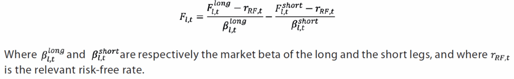 While the market factor is cap-weighted, stocks in the long and short leg of each regressor are equally weighted. Each regressor (with the exception of the market factor) is constructed by longing the 20% of stocks with the highest performance expectations with respect to a given characteristics (overperformers) and shorting the 20% of stocks with the lowest performance expectation (underperformer). For instance, the long leg of the “Size” factor contains the 20% smallest companies with equal weights. The relative weight of each leg in the final portfolio is calculated so as to cancel the exposure of the factor to the market factor. At the end of each quarter, the market exposure is computed for both the long and short leg using daily returns. The relative weight of each leg is then adjusted as follows so as to neutralize the market exposure of the factor: